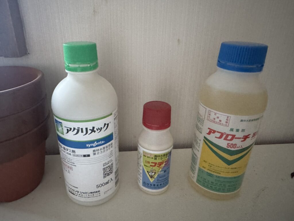 それぞれの薬剤には展着剤としてアプローチBIを混ぜて使用しています。